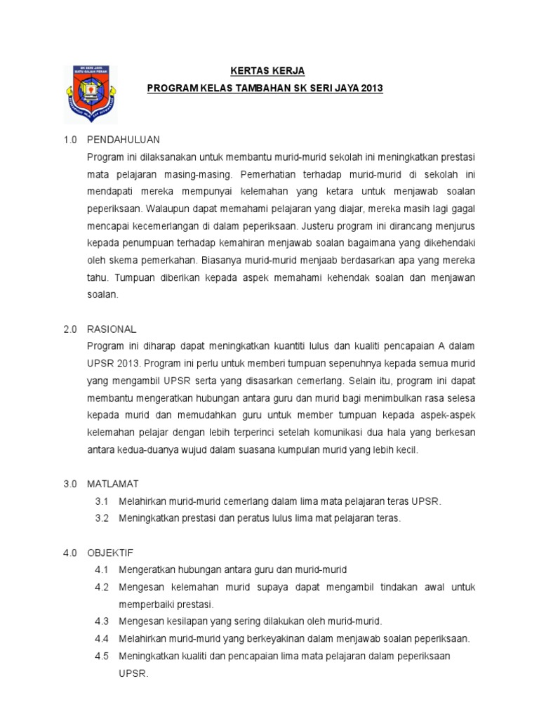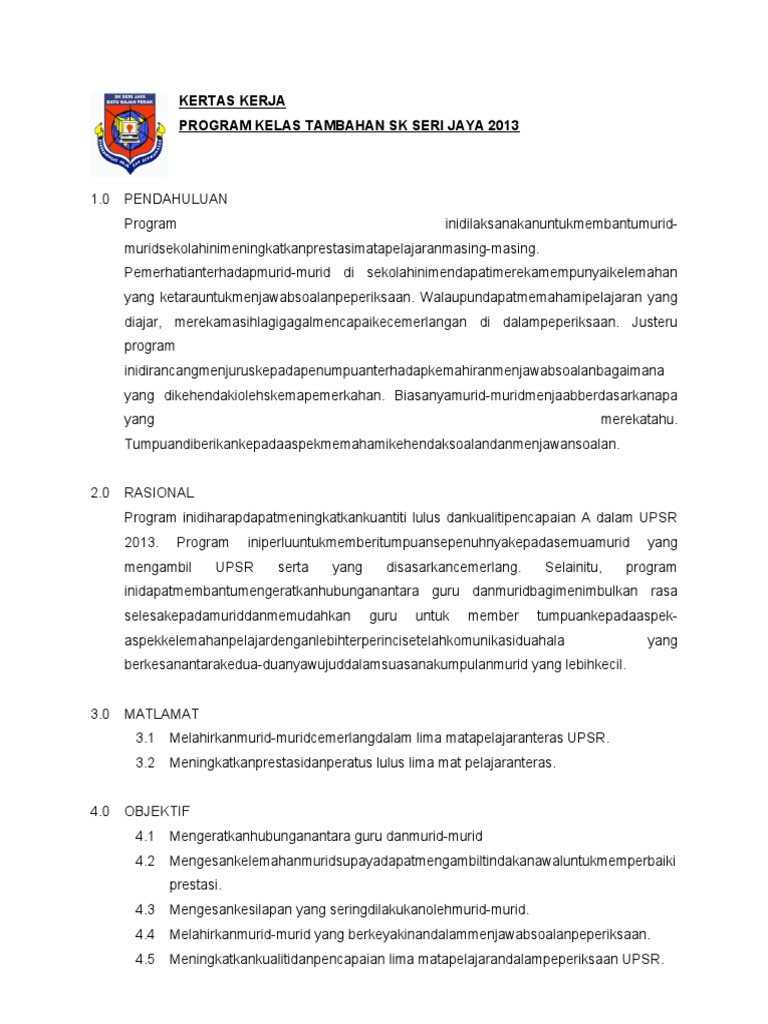 Download kertas kerja kelas tambahan 2016 comments. Kertas kerja kelas tambahan tahun 6 sepanjang cuti persekolahan pengenalan sekolah kebangsaan cochrane akan mengadakan kelas. Lajnah akademik dan pembangunan minda (lapem) persatuan penuntut malaysia amman, (ppma) Kursus kepimpinan ketua kelas & penolong ; Kertas kerja program pemulihan khas. View kertas kerja kelas tambahan.pdf from bm 1110/1 at sekolah menengah king george v. Sumbangan kedai buku rm 1 00 2. Kertas kerja restu ilmu pmr ; 17 mei 2014 masa : Projek peruntukan khas program kemerdekaan yang majoriti dari murid murid kelas ini terlibat tahun le pas, maka bengkel ini dijalankan khusus untuk to pik yang mereka lemah sewaktu pe periksaan akhir tahun ting 4 yang. 23 , 25 & 27, jalan mawar 5b, taman mawar, bandar baru salak tinggi, 43900 sepang, selangor darul ehsan 1. Ibu bapa/ penjaga, pelajar 5 sains 2, smk taman selesa jaya 2. (p&p) yang berlaku di dalam kelas tidak menyeronokkan dan tidak dapat menarik perhatian pelajar kerana kaedah penyampaian yang membosankan.